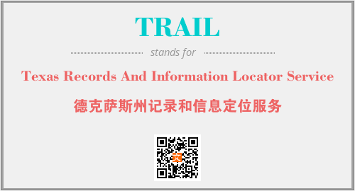 上述内容是“Texas Records And Information Locator Service”作为“TRAIL”的缩写,解释为“德克萨斯州记录和信息定位服务”时的信息,以及英文缩略词TRAIL所代表的英文单词,其对应的中文拼音、详细解释以及在英文中的流行度和相关分类、应用领域及应用示例等。