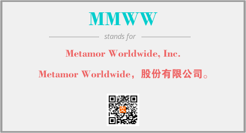 上述内容是“Metamor Worldwide, Inc.”作为“MMWW”的缩写,解释为“Metamor Worldwide,股份有限公司。”时的信息,以及英文缩略词MMWW所代表的英文单词,其对应的中文拼音、详细解释以及在英文中的流行度和相关分类、应用领域及应用示例等。