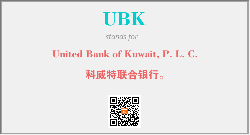 上述内容是“United Bank of Kuwait, P. L. C.”作为“UBK”的缩写,解释为“科威特联合银行。”时的信息,以及英文缩略词UBK所代表的英文单词,其对应的中文拼音、详细解释以及在英文中的流行度和相关分类、应用领域及应用示例等。