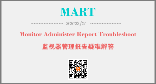 英文缩略词“MART”经常作为“Monitor Administer Report Troubleshoot”的英文缩写来使用,中文表示:“监视器管理报告疑难解答”。本文将详细介绍英文缩写词MART所代表英文单词,其对应的中文拼音、详细解释以及在英语中的流行度。此外,还有关于缩略词MART的分类、应用领域及相关应用示例等。
