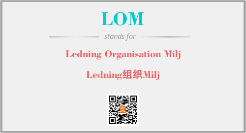 英文缩略词“LOM”经常作为“Ledning Organisation Milj”的英文缩写来使用,中文表示:“Ledning组织Milj”。本文将详细介绍英文缩写词LOM所代表英文单词,其对应的中文拼音、详细解释以及在英语中的流行度。此外,还有关于缩略词LOM的分类、应用领域及相关应用示例等。