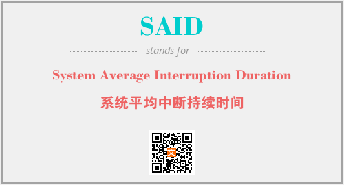 上述内容是“System Average Interruption Duration”作为“SAID”的缩写,解释为“系统平均中断持续时间”时的信息,以及英文缩略词SAID所代表的英文单词,其对应的中文拼音、详细解释以及在英文中的流行度和相关分类、应用领域及应用示例等。