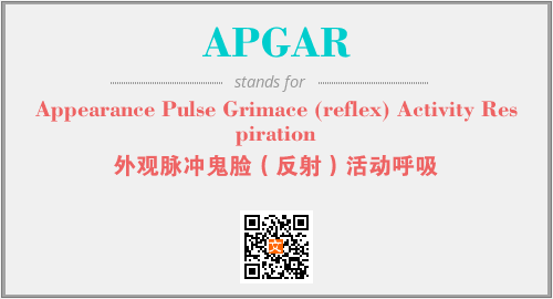 上述内容是“Appearance Pulse Grimace (reflex) Activity Respiration”作为“APGAR”的缩写,解释为“外观脉冲鬼脸(反射)活动呼吸”时的信息,以及英文缩略词APGAR所代表的英文单词,其对应的中文拼音、详细解释以及在英文中的流行度和相关分类、应用领域及应用示例等。