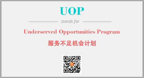 上述内容是“Underserved Opportunities Program”作为“UOP”的缩写,解释为“服务不足机会计划”时的信息,以及英文缩略词UOP所代表的英文单词,其对应的中文拼音、详细解释以及在英文中的流行度和相关分类、应用领域及应用示例等。
