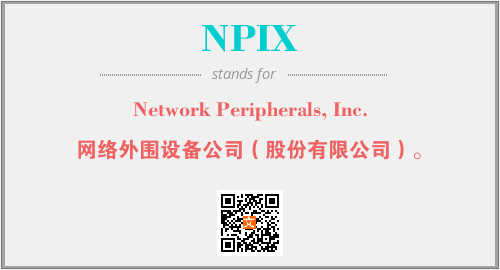 上述内容是“Network Peripherals, Inc.”作为“NPIX”的缩写,解释为“网络外围设备公司(股份有限公司)。”时的信息,以及英文缩略词NPIX所代表的英文单词,其对应的中文拼音、详细解释以及在英文中的流行度和相关分类、应用领域及应用示例等。