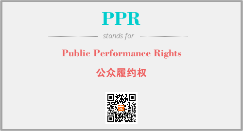 上述内容是“Public Performance Rights”作为“PPR”的缩写,解释为“公众履约权”时的信息,以及英文缩略词PPR所代表的英文单词,其对应的中文拼音、详细解释以及在英文中的流行度和相关分类、应用领域及应用示例等。