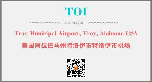 上述内容是“Troy Municipal Airport, Troy, Alabama USA”作为“TOI”的缩写,解释为“美国阿拉巴马州特洛伊市特洛伊市机场”时的信息,以及英文缩略词TOI所代表的英文单词,其对应的中文拼音、详细解释以及在英文中的流行度和相关分类、应用领域及应用示例等。