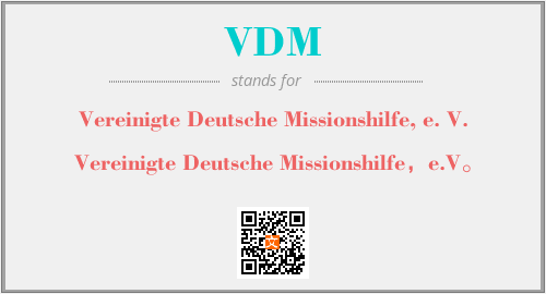 上述内容是“Vereinigte Deutsche Missionshilfe, e. V.”作为“VDM”的缩写,解释为“Vereinigte Deutsche Missionshilfe,e.V。”时的信息,以及英文缩略词VDM所代表的英文单词,其对应的中文拼音、详细解释以及在英文中的流行度和相关分类、应用领域及应用示例等。
