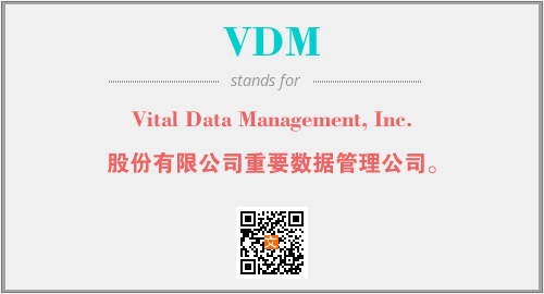 英文缩略词“VDM”经常作为“Vital Data Management, Inc.”的英文缩写来使用,中文表示:“股份有限公司重要数据管理公司。”。本文将详细介绍英文缩写词VDM所代表英文单词,其对应的中文拼音、详细解释以及在英语中的流行度。此外,还有关于缩略词VDM的分类、应用领域及相关应用示例等。
