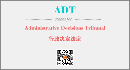 英文缩略词“ADT”经常作为“Administrative Decisions Tribunal”的英文缩写来使用,中文表示:“行政决定法庭”。本文将详细介绍英文缩写词ADT所代表英文单词,其对应的中文拼音、详细解释以及在英语中的流行度。此外,还有关于缩略词ADT的分类、应用领域及相关应用示例等。