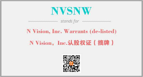上述内容是“N Vision, Inc. Warrants (de-listed)”作为“NVSNW”的缩写,解释为“N Vision,Inc.认股权证(摘牌)”时的信息,以及英文缩略词NVSNW所代表的英文单词,其对应的中文拼音、详细解释以及在英文中的流行度和相关分类、应用领域及应用示例等。