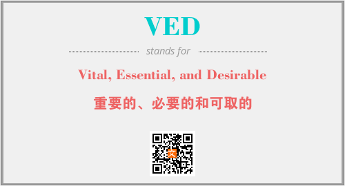 英文缩略词“VED”经常作为“Vital, Essential, and Desirable”的英文缩写来使用,中文表示:“重要的、必要的和可取的”。本文将详细介绍英文缩写词VED所代表英文单词,其对应的中文拼音、详细解释以及在英语中的流行度。此外,还有关于缩略词VED的分类、应用领域及相关应用示例等。