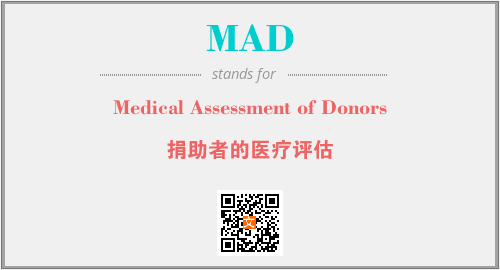 英文缩略词“MAD”经常作为“Medical Assessment of Donors”的英文缩写来使用,中文表示:“捐助者的医疗评估”。本文将详细介绍英文缩写词MAD所代表英文单词,其对应的中文拼音、详细解释以及在英语中的流行度。此外,还有关于缩略词MAD的分类、应用领域及相关应用示例等。
