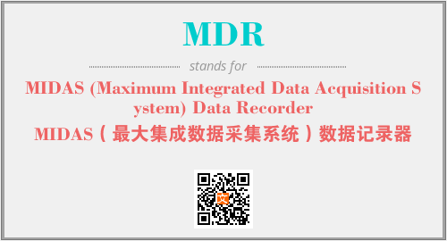 英文缩略词“MDR”经常作为“MIDAS (Maximum Integrated Data Acquisition System) Data Recorder”的英文缩写来使用,中文表示:“MIDAS(最大集成数据采集系统)数据记录器”。本文将详细介绍英文缩写词MDR所代表英文单词,其对应的中文拼音、详细解释以及在英语中的流行度。此外,还有关于缩略词MDR的分类、应用领域及相关应用示例等。