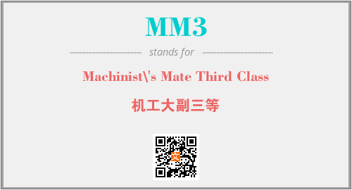 上述内容是“Machinist\'s Mate Third Class”作为“MM3”的缩写,解释为“机工大副三等”时的信息,以及英文缩略词MM3所代表的英文单词,其对应的中文拼音、详细解释以及在英文中的流行度和相关分类、应用领域及应用示例等。