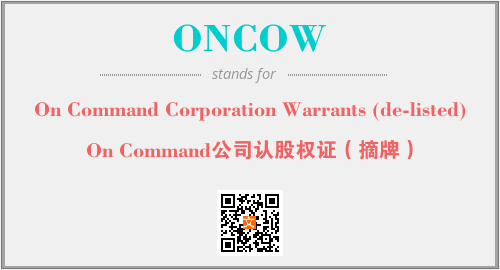 上述内容是“On Command Corporation Warrants (de-listed)”作为“ONCOW”的缩写,解释为“On Command公司认股权证(摘牌)”时的信息,以及英文缩略词ONCOW所代表的英文单词,其对应的中文拼音、详细解释以及在英文中的流行度和相关分类、应用领域及应用示例等。