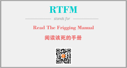 上述内容是“Read The Frigging Manual”作为“RTFM”的缩写,解释为“阅读该死的手册”时的信息,以及英文缩略词RTFM所代表的英文单词,其对应的中文拼音、详细解释以及在英文中的流行度和相关分类、应用领域及应用示例等。