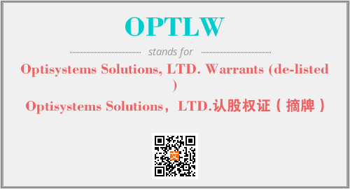上述内容是“Optisystems Solutions, LTD. Warrants (de-listed)”作为“OPTLW”的缩写,解释为“Optisystems Solutions,LTD.认股权证(摘牌)”时的信息,以及英文缩略词OPTLW所代表的英文单词,其对应的中文拼音、详细解释以及在英文中的流行度和相关分类、应用领域及应用示例等。