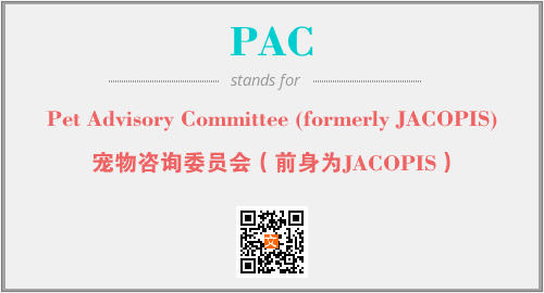 上述内容是“Pet Advisory Committee (formerly JACOPIS)”作为“PAC”的缩写,解释为“宠物咨询委员会(前身为JACOPIS)”时的信息,以及英文缩略词PAC所代表的英文单词,其对应的中文拼音、详细解释以及在英文中的流行度和相关分类、应用领域及应用示例等。