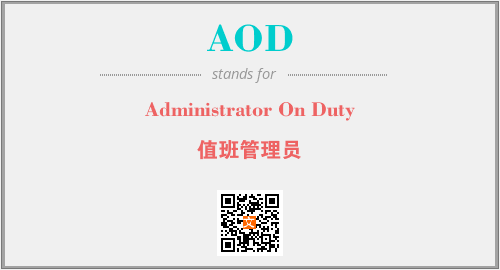 英文缩略词“AOD”经常作为“Administrator On Duty”的英文缩写来使用,中文表示:“值班管理员”。本文将详细介绍英文缩写词AOD所代表英文单词,其对应的中文拼音、详细解释以及在英语中的流行度。此外,还有关于缩略词AOD的分类、应用领域及相关应用示例等。