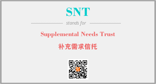 上述内容是“Supplemental Needs Trust”作为“SNT”的缩写,解释为“补充需求信托”时的信息,以及英文缩略词SNT所代表的英文单词,其对应的中文拼音、详细解释以及在英文中的流行度和相关分类、应用领域及应用示例等。