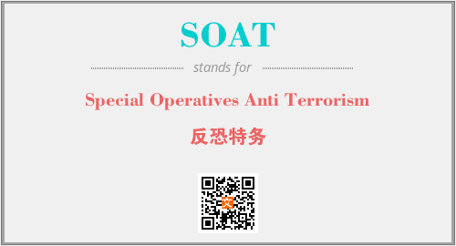 上述内容是“Special Operatives Anti Terrorism”作为“SOAT”的缩写,解释为“反恐特务”时的信息,以及英文缩略词SOAT所代表的英文单词,其对应的中文拼音、详细解释以及在英文中的流行度和相关分类、应用领域及应用示例等。
