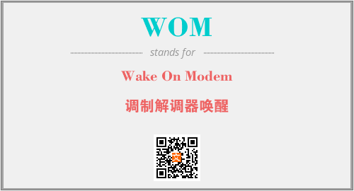 英文缩略词“WOM”经常作为“Wake On Modem”的英文缩写来使用,中文表示:“调制解调器唤醒”。本文将详细介绍英文缩写词WOM所代表英文单词,其对应的中文拼音、详细解释以及在英语中的流行度。此外,还有关于缩略词WOM的分类、应用领域及相关应用示例等。