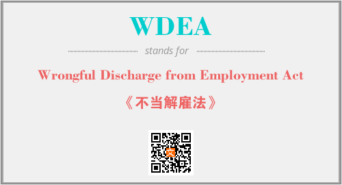 上述内容是“Wrongful Discharge from Employment Act”作为“WDEA”的缩写,解释为“《不当解雇法》”时的信息,以及英文缩略词WDEA所代表的英文单词,其对应的中文拼音、详细解释以及在英文中的流行度和相关分类、应用领域及应用示例等。