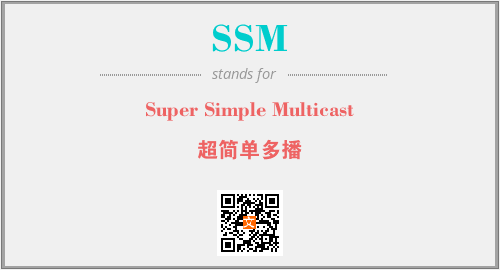 英文缩略词“SSM”经常作为“Super Simple Multicast”的英文缩写来使用,中文表示:“超简单多播”。本文将详细介绍英文缩写词SSM所代表英文单词,其对应的中文拼音、详细解释以及在英语中的流行度。此外,还有关于缩略词SSM的分类、应用领域及相关应用示例等。