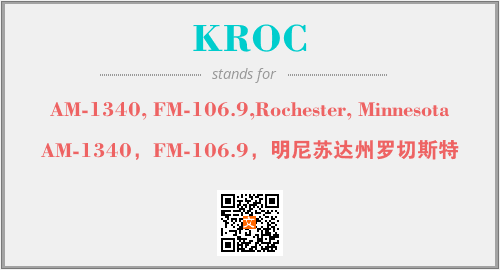 上述内容是“AM-1340, FM-106.9,Rochester, Minnesota”作为“KROC”的缩写,解释为“AM-1340,FM-106.9,明尼苏达州罗切斯特”时的信息,以及英文缩略词KROC所代表的英文单词,其对应的中文拼音、详细解释以及在英文中的流行度和相关分类、应用领域及应用示例等。