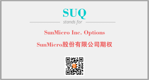 上述内容是“SunMicro Inc. Options”作为“SUQ”的缩写,解释为“SunMicro股份有限公司期权”时的信息,以及英文缩略词SUQ所代表的英文单词,其对应的中文拼音、详细解释以及在英文中的流行度和相关分类、应用领域及应用示例等。