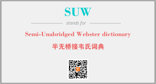 英文缩略词“SUW”经常作为“Semi-Unabridged Webster dictionary”的英文缩写来使用,中文表示:“半无桥接韦氏词典”。本文将详细介绍英文缩写词SUW所代表英文单词,其对应的中文拼音、详细解释以及在英语中的流行度。此外,还有关于缩略词SUW的分类、应用领域及相关应用示例等。