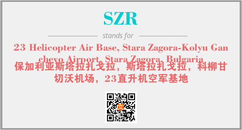 英文缩略词“SZR”经常作为“23 Helicopter Air Base, Stara Zagora-Kolyu Ganchevo Airport, Stara Zagora, Bulgaria”的英文缩写来使用,中文表示:“保加利亚斯塔拉扎戈拉,斯塔拉扎戈拉,科柳甘切沃机场,23直升机空军基地”。本文将详细介绍英文缩写词SZR所代表英文单词,其对应的中文拼音、详细解释以及在英语中的流行度。此外,还有关于缩略词SZR的分类、应用领域及相关应用示例等。