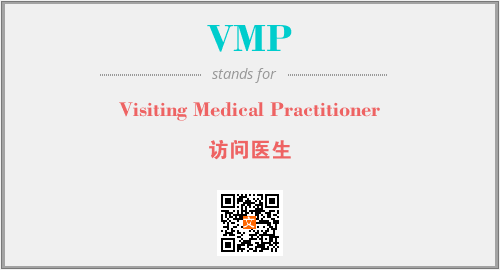 英文缩略词“VMP”经常作为“Visiting Medical Practitioner”的英文缩写来使用,中文表示:“访问医生”。本文将详细介绍英文缩写词VMP所代表英文单词,其对应的中文拼音、详细解释以及在英语中的流行度。此外,还有关于缩略词VMP的分类、应用领域及相关应用示例等。
