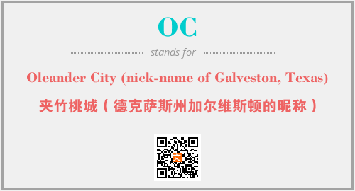 上述内容是“Oleander City (nick-name of Galveston, Texas)”作为“OC”的缩写,解释为“夹竹桃城(德克萨斯州加尔维斯顿的昵称)”时的信息,以及英文缩略词OC所代表的英文单词,其对应的中文拼音、详细解释以及在英文中的流行度和相关分类、应用领域及应用示例等。