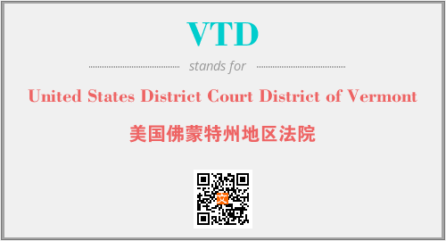 上述内容是“United States District Court District of Vermont”作为“VTD”的缩写,解释为“美国佛蒙特州地区法院”时的信息,以及英文缩略词VTD所代表的英文单词,其对应的中文拼音、详细解释以及在英文中的流行度和相关分类、应用领域及应用示例等。