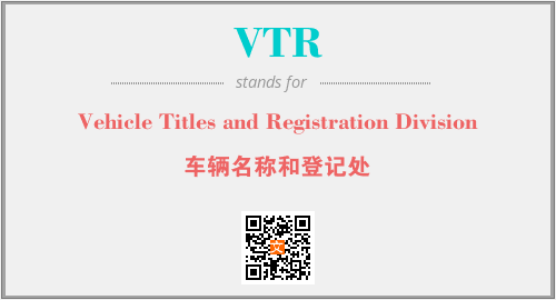 上述内容是“Vehicle Titles and Registration Division”作为“VTR”的缩写,解释为“车辆名称和登记处”时的信息,以及英文缩略词VTR所代表的英文单词,其对应的中文拼音、详细解释以及在英文中的流行度和相关分类、应用领域及应用示例等。