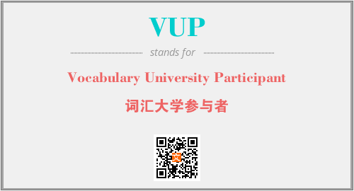 英文缩略词“VUP”经常作为“Vocabulary University Participant”的英文缩写来使用,中文表示:“词汇大学参与者”。本文将详细介绍英文缩写词VUP所代表英文单词,其对应的中文拼音、详细解释以及在英语中的流行度。此外,还有关于缩略词VUP的分类、应用领域及相关应用示例等。