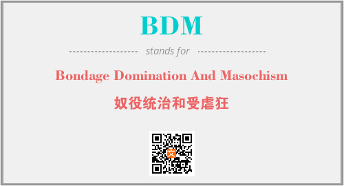 英文缩略词“BDM”经常作为“Bondage Domination And Masochism”的英文缩写来使用,中文表示:“奴役统治和受虐狂”。本文将详细介绍英文缩写词BDM所代表英文单词,其对应的中文拼音、详细解释以及在英语中的流行度。此外,还有关于缩略词BDM的分类、应用领域及相关应用示例等。