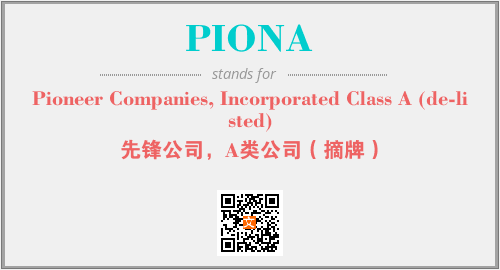 上述内容是“Pioneer Companies, Incorporated Class A (de-listed)”作为“PIONA”的缩写,解释为“先锋公司,A类公司(摘牌)”时的信息,以及英文缩略词PIONA所代表的英文单词,其对应的中文拼音、详细解释以及在英文中的流行度和相关分类、应用领域及应用示例等。