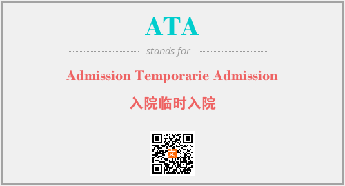 英文缩略词“ATA”经常作为“Admission Temporarie Admission”的英文缩写来使用,中文表示:“入院临时入院”。本文将详细介绍英文缩写词ATA所代表英文单词,其对应的中文拼音、详细解释以及在英语中的流行度。此外,还有关于缩略词ATA的分类、应用领域及相关应用示例等。