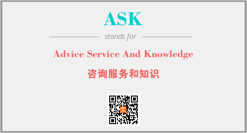 英文缩略词“ASK”经常作为“Advice Service And Knowledge”的英文缩写来使用,中文表示:“咨询服务和知识”。本文将详细介绍英文缩写词ASK所代表英文单词,其对应的中文拼音、详细解释以及在英语中的流行度。此外,还有关于缩略词ASK的分类、应用领域及相关应用示例等。