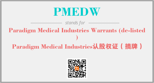 上述内容是“Paradigm Medical Industries Warrants (de-listed)”作为“PMEDW”的缩写,解释为“Paradigm Medical Industries认股权证(摘牌)”时的信息,以及英文缩略词PMEDW所代表的英文单词,其对应的中文拼音、详细解释以及在英文中的流行度和相关分类、应用领域及应用示例等。