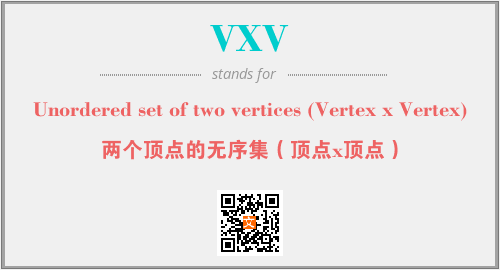 上述内容是“Unordered set of two vertices (Vertex x Vertex)”作为“VXV”的缩写,解释为“两个顶点的无序集(顶点x顶点)”时的信息,以及英文缩略词VXV所代表的英文单词,其对应的中文拼音、详细解释以及在英文中的流行度和相关分类、应用领域及应用示例等。