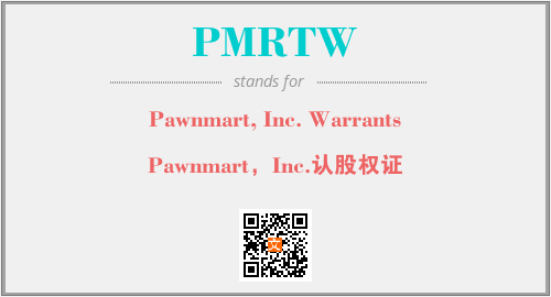 英文缩略词“PMRTW”经常作为“Pawnmart, Inc. Warrants”的英文缩写来使用,中文表示:“Pawnmart,Inc.认股权证”。本文将详细介绍英文缩写词PMRTW所代表英文单词,其对应的中文拼音、详细解释以及在英语中的流行度。此外,还有关于缩略词PMRTW的分类、应用领域及相关应用示例等。