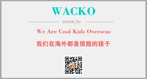 上述内容是“We Are Cool Kids Overseas”作为“WACKO”的缩写,解释为“我们在海外都是很酷的孩子”时的信息,以及英文缩略词WACKO所代表的英文单词,其对应的中文拼音、详细解释以及在英文中的流行度和相关分类、应用领域及应用示例等。