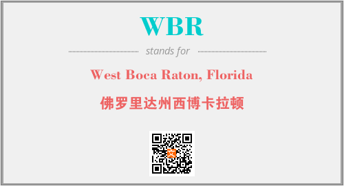 上述内容是“West Boca Raton, Florida”作为“WBR”的缩写,解释为“佛罗里达州西博卡拉顿”时的信息,以及英文缩略词WBR所代表的英文单词,其对应的中文拼音、详细解释以及在英文中的流行度和相关分类、应用领域及应用示例等。