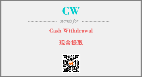 上述内容是“Cash Withdrawal”作为“CW”的缩写,解释为“现金提取”时的信息,以及英文缩略词CW所代表的英文单词,其对应的中文拼音、详细解释以及在英文中的流行度和相关分类、应用领域及应用示例等。