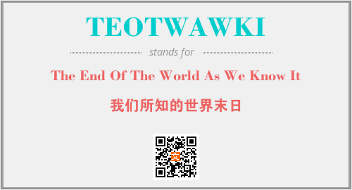 以上为The End Of The World As We Know It英文缩略词TEOTWAWKI的中文解释,以及该英文缩写在英语的流行度、分类和应用领域方面的信息。