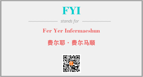 上述内容是“Fer Yer Infermaeshun”作为“FYI”的缩写,解释为“费尔耶·费尔马顺”时的信息,以及英文缩略词FYI所代表的英文单词,其对应的中文拼音、详细解释以及在英文中的流行度和相关分类、应用领域及应用示例等。